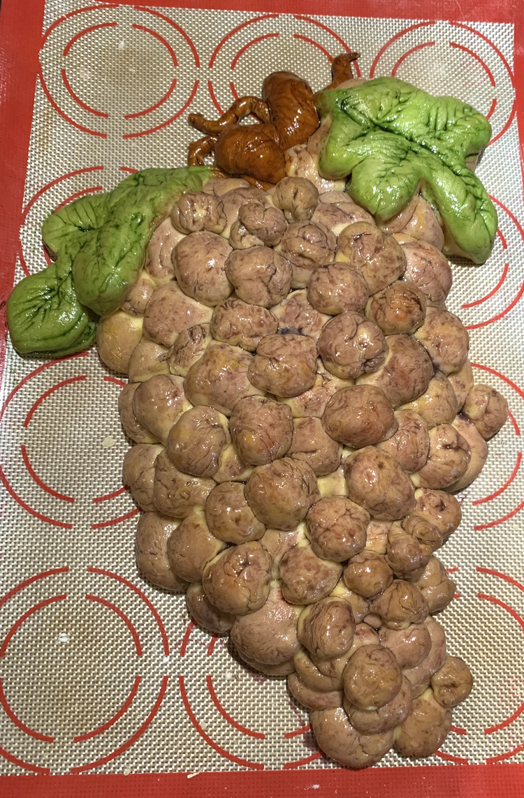 I lined a baking sheet with a silpat (you can use parchment paper) and arranged the little dough balls into a cluster of grapes.